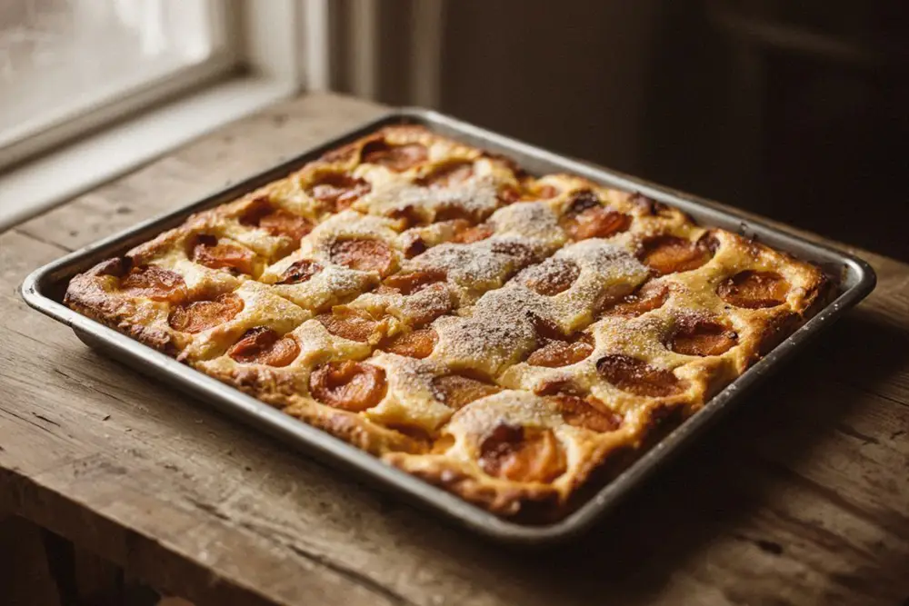 This is the quintessential Central European summer sheet pie — a large-format yeast-based tray bake that feeds a crowd from a single baking sheet. The structure is simple: an enriched dough forms the base, fresh apricots cover it completely, and a warm custard of cream, egg yolks, and ground almonds is poured over the partially baked surface and returned to the oven to set. The result is something between a fruit tart and a custard cake — the dough absorbs the juices from the apricots, the custard turns golden at the edges, and the whole thing is finished with a generous dusting of vanilla sugar.