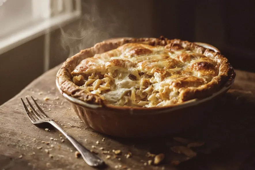 The recipe was filed under the heading “Pasta Dessert” — a title that misleads on both counts. There is nothing sweet here, and despite the pasta, this is firmly a pastry dish. It reads more like a cook’s practical experiment than a standard recipe: a way to stretch a pasta component into something more substantial by wrapping it in the familiar architecture of a pie. The result is rich, deeply savoury, and filling in the way that only lard-enriched pastry and aged cheese together can be.