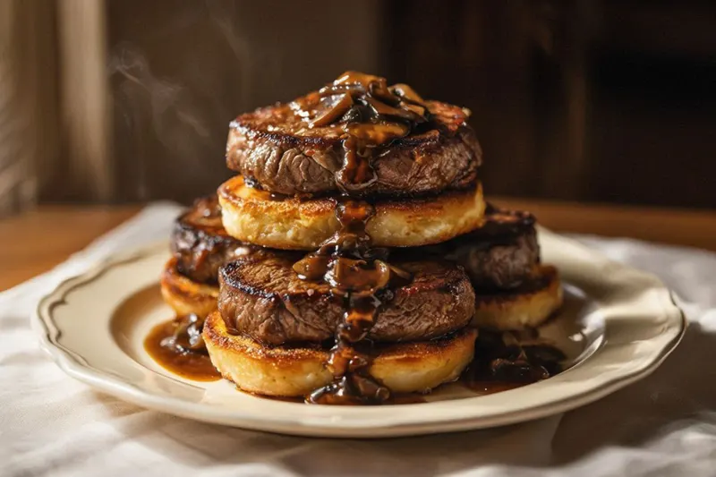 There is something quietly theatrical about this dish. A round of beef, precisely shaped, placed on a golden fried crouton, crowned with a glossy mushroom sauce — this is not everyday cooking. It is the kind of recipe that appears in early 20th century cookbooks written for households that entertained, that cared about presentation, and that were quietly translating the language of French restaurant cooking into their own domestic kitchens.